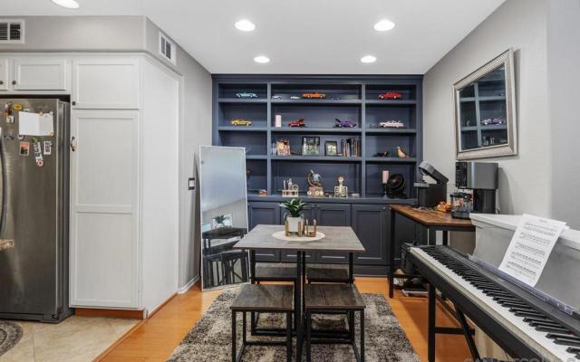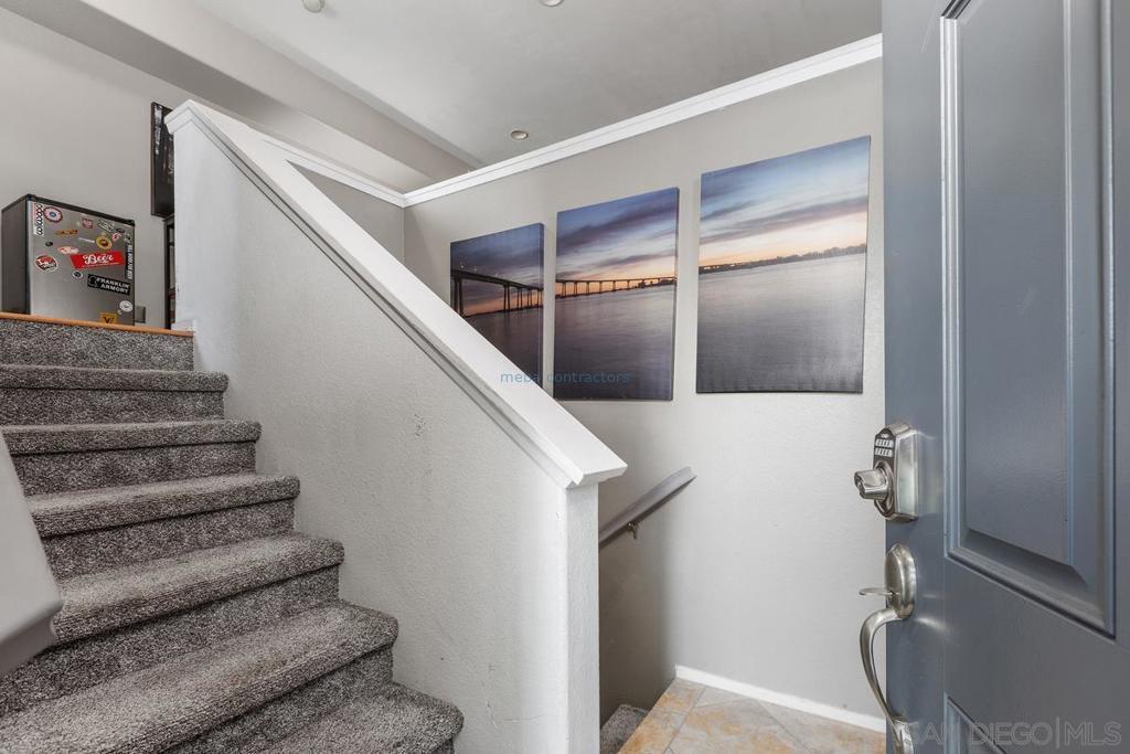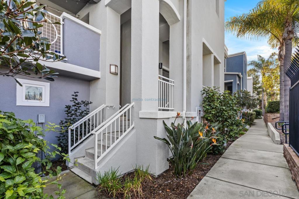 Welcome to Cabrillo at the Bay, a gated townhome community in the heart of Point Loma built in 2006, where convenience, design and lifestyle come together. This two-story townhome offers 1,227 square feet of well-planned living space above an oversized two-car tandem garage with direct access, plus a bonus room ideal for a home office or flexible storage space. The main living level is designed for easy, everyday living. Natural hardwood floors, complemented by travertine tile in the entry, kitchen, and baths, and carpeted bedrooms & stairs. The kitchen features granite countertops, stainless steel appliances that convey, and timeless wood cabinetry, opening seamlessly to the dining area with a custom built-in hutch. Step outside to the private balcony and take in unobstructed views of the pool and communityperfect for morning coffee or unwinding at the end of the day. Down the hall, you'll pass a full size washer/dryer on the way to your primary suite offering a calm retreat with ensuite bathroom - dual vanities, a glass-enclosed shower, soaking tub, and double closet areas with mirrored closet doors. The secondary bedroom is generously sized and conveniently located near the hall bath with a full tub and shower. This home is ideally positioned within the gated community and the city, offering resort-style amenities including a pool, spa, BBQ area, playground, and clubhouse, all with low HOA dues of just $265 per month. Centrally located near shopping, dining, Kaiser facilities, the Sports Arena, freeways, downtown San Diego, and the coast.